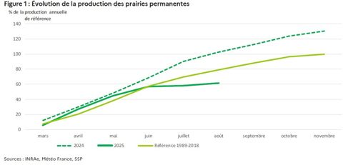 Au 20 août 2025, la production cumulée d’herbe depuis le début de l’année est inférieure de 23 % à la moyenne observée sur la période de référence de 1989-2018. Cette situation contraste avec celle du printemps car au 20 mai, la pousse était excédentaire de 17 %.