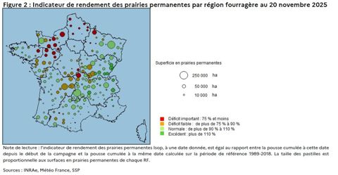 Au niveau national, un tiers des régions fourragères ont une pousse supérieure à la normale en 2025. Plus de 40 % ont un déficit supérieur à 10 %, elles représentent 44 % des surfaces en prairies permanentes. Dans le dernier quart des régions fourragères, la pousse est inférieure de moins de 10 % à la normale.