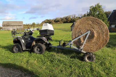 Le quad joue un rôle essentiel dans cette organisation. Il est équipé d’un système (Kiwi Tech) qui permet d’installer le fil électrique et les piquets sans descendre du véhicule. La pose n’est ainsi pas une corvée. L’équipement, attelé à une dérouleuse sert aussi pour l’affourragement en hiver. « Cette dérouleuse est un modèle autoconstruit, mais nous prévoyons d’en acheter un en Angleterre, car nous n’en avons pas trouvé sur le marché français », explique Pierre-Antoine. L’abreuvement s’effectue grâce à un petit modèle d’abreuvoir (80 litres). Il est ainsi facilement déplaçable pour éviter tout piétinement excessif.