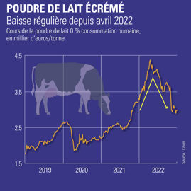 Engagé en avril 2022, le repli du cours de la poudre de lait écrémé se poursuit et inquiète les producteurs laitiers. Avec un prix sous la barre des 3 000 €/t en décembre 2022, son niveau était inférieur de 10 % à celui de décembre 2021. « Les données de production, d’importations et d’exportations semblent indiquer qu’il y a des stocks de poudre dans l’Union européenne à 27 », commente Jean-Marc Chaumet, le directeur du service de l'économie du Cniel. Les prix élevés des ingrédients, couplés à la hausse de la production chinoise ont conduit à une diminution des exportations européennes par rapport à 2021. Le recul de la collecte européenne sur les neuf premiers mois de l'année a également limité les disponibilités.