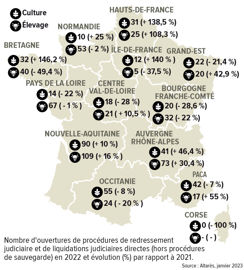 Par Région, la Nouvelle-Aquitaine enregistre le plus de défaillances d’exploitations, culture et élevage compris (222). C’est la deuxième Région en nombre d’exploitation (64 200 exploitations en 2020, selon Agreste). La première, l’Occitanie (64 370 exploitations), s’en tire à peine mieux avec 107 défaillances.