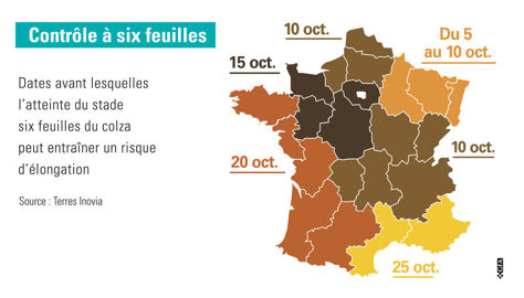 Seul le cumul de plusieurs facteurs de risque peut justifier une régulation automnale. La date d’atteinte du stade six feuilles constitue d’abord un bon repère. Globalement, s’il survient avant le 5 et jusqu’au 25 octobre selon les régions (voir la carte ci-dessous), le recours au régulateur est envisageable. La réflexion peut donc être engagée en prenant en compte la sensibilité variétale à ce phénomène, la densité, la réserve azotée et enfin l’état de croissance du colza.