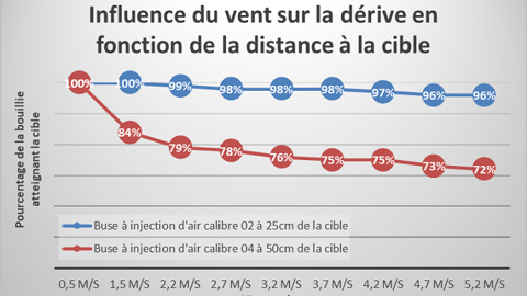 L’idée est ensuite de faire varier la vitesse du vent pour voir son influence sur la dérive de la pulvérisation. C’est d’ailleurs à partir de ce même type de test que sont testées les buses homologuées ZNT. Ce que l’on constate à partir de cette expérience, c’est qu’à 50 cm de la cible dès une vitesse de vent de 2,5 m/s (soit 9 km/h), près de 20 % de la bouillie a dérivé. À l’inverse, à 25 cm de la cible, on ne constate qu’une très faible dérive de la bouillie. D’autres expériences similaires au champ nous ont permis d’observer les mêmes tendances.