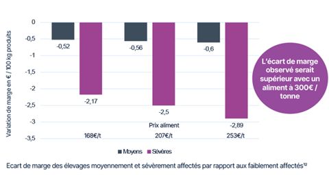 S’agissant du mycoplasme, une étude Anses Ifip (Aubry et al., 2010) a montré que les élevages faiblement atteints par la pathologie respiratoire avaient une marge supérieure de 2,89 € / 100 kg de porc produit comparé aux élevages fortement atteints (pour un coût d’aliment sevrage-vente de 253 € par tonne alors que nous sommes à plus de 300 maintenant). Conséquence liée à une baisse de croissance mais surtout à une dégradation de l’indice.