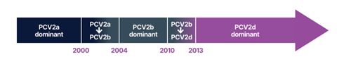 Cependant, ce petit virus à ADN non enveloppé a démontré sa capacité d’adaptation. Il évolue régulièrement, se présentant sous différentes versions, un peu comme des « mises à jour ». Ces évolutions sont appelées des génotypes. A l’arrivée de la maladie en France, la version dominante était le PCV2a. Aujourd’hui, c’est le PCV2d qui domine en France et en Europe. Cette émergence et domination du génotype 2d rappellent que le PCV2 n’est pas figé. Au niveau de l’exploitation, la majeure partie des pertes économiques dues au PCV2 est maintenant attribuable aux infections subcliniques des porcs.