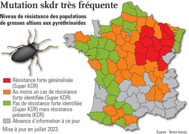 Si une intervention doit avoir lieu, il est conseillé d’employer un pyréthrinoïde avec de bonnes conditions de traitement, soit en soirée, car l’adulte est actif à ce moment-là. En revanche, « pour les régions à fortes résistances généralisées aux pyréthrinoïdes (voir l'encadré ci-dessous), la seule solution passe par un semis et une levée précoce », juge Terres Inovia.