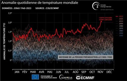 Cet écart thermique est établi pour la durée d’une journée, au cours de laquelle la température moyenne mondiale a été plus de 2°C au-dessus de la moyenne de la période préindustrielle. Des données provisoires font état d’un nouveau dépassement du seuil le 18 novembre 2023, avec une anomalie de température également supérieure de 2°C à la moyenne.