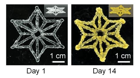 Ils ont développé une encre pour l’impression 3D composée de cellules de tabac, de gélatine et de microparticules d’hydrogel (1) contenant une bactérie couramment utilisée pour transférer des segments d’ADN dans les génomes végétaux : Agrobacterium tumefaciens. Cette bio-encre a ensuite été imprimée en 3D sous différentes formes comme des flocons de neige, des feuilles ou des spirales. L’hydrogel contenu dans les matériaux imprimés est durci à la lumière bleue, ce qui solidifie les structures. Les cellules végétales se développent dans ces agencements et produisent les protéines dictées par l’ADN transféré, ici des protéines fluorescentes vertes ou des pigments végétaux rouges ou jaunes.
