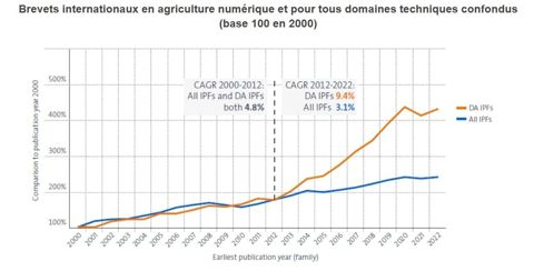 Les résultats de cette étude des dépôts de brevets publiée en septembre 2025 sont sans appel : jusqu’en 2012, le rythme des inventions en agriculture numérique se situait dans la moyenne des autres domaines techniques. Mais depuis une dizaine d’années, il augmente trois fois plus rapidement, avec une croissance moyenne annuelle de 9,4 % du nombre de demandes de brevets déposées dans le secteur.