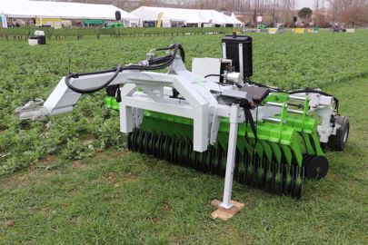Le timon est piloté. Il peut ainsi suivre la machine qui le tracte où être fixe. Le guidage est assuré par une antenne GPS. La soufflerie du semoir est assurée par une turbine électrique. Celle-ci, comme la pompe hydraulique est alimentée par un courant de 48 V. La trémie peut recevoir plusieurs compartiments en fonction de la demande de l’utilisateur. Chaque compartiment reçoit un moteur pour entraîner le doseur fait maison. La société Softi-Rob est également venue avec une bineuse Roll N Sem adaptée à son rover. Cet outil sert à griffer l’adventice pour la faire mourir. Le guidage de la bineuse est assuré par deux disques et par le timon articulé. Lors des demi-tours, les roues viennent prendre le relais pour lever l’outil. Un pulvérisateur a également été présenté. Celui-ci, en plus d’être entraîné par le robot, est doté d’un système PWM géré par une interface électronique faite « maison ».