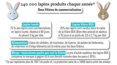 Positionné depuis plus de vingt-cinq ans sur les lapins lourds de 3 kg, plus rémunérateurs que les standards, l’élevage s’est diversifié en 2017 sur les lapins bien-être animal (BEA) à la demande de l’abattoir Palmid’or/LDC (Trambly, 71).