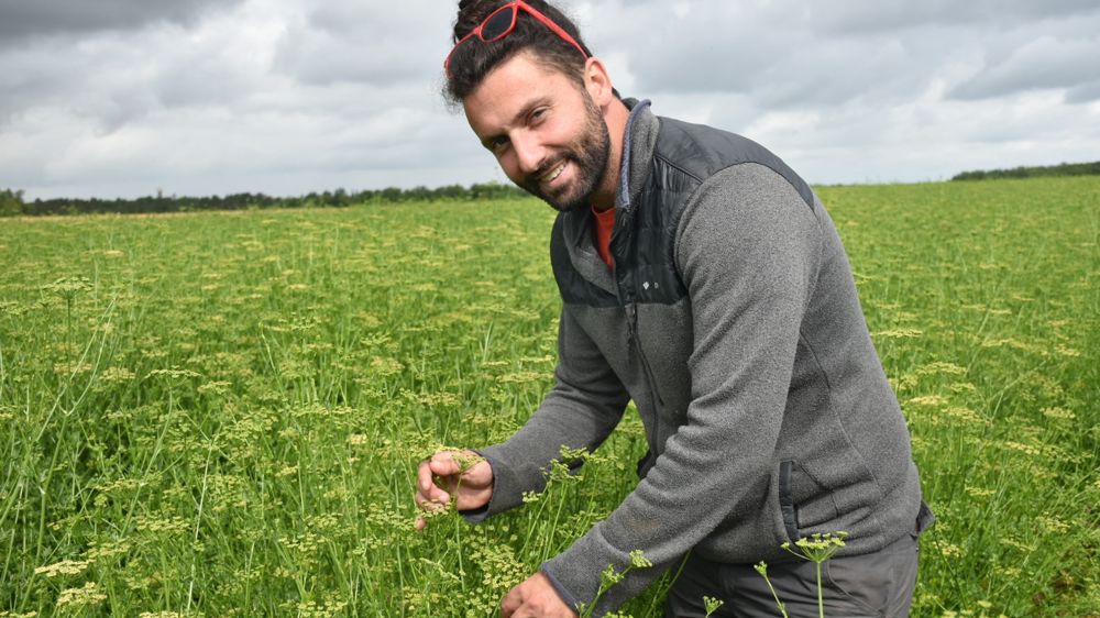 Dans le persil monté à graine, Dorian Sagot observe un aleo-thrips, un insecte auxiliaire qui l’aide dans la lutte contre les thrips sur oignon. Installé à Rouvres-Saint-Jean, au nord du Loiret, avec son père Alain, et son voisin Gilles Desforges, ce jeune trentenaire cultive du persil porte-graine associé à de la féverole, elle aussi en porte-graine. Depuis 2020, la ferme des Trois Roviers est passée en agriculture de conservation, un challenge pour une rotation très diversifiée, qui compte des cultures industrielles comme des oignons ou des betteraves.
