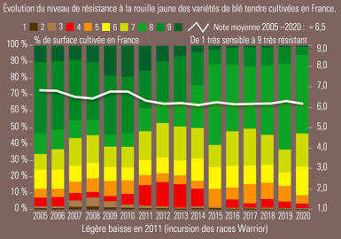 La rouille jaune a en revanche constitué le sujet principal de préoccupation (voir encadré) avec une apparition assez précoce et un développement fort sur le littoral de la Manche et le nord du Bassin Parisien. De façon moins marquée, la maladie a aussi été observée sur toute la grande façade atlantique, la frange ouest de la région Centre et sur la Champagne.