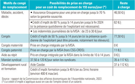 Le coût d’une journée de remplacement est en moyenne de 150 à 160 € par jour (salaire et charges sociales incluses). Selon la raison du besoin de remplacement, plusieurs dispositifs existent pour prendre en charge tout ou partie du coût (cf tableau). À noter que le crédit d'impôt remplacement en cas de congés, maladie, accident ou décès, est conditionné au fait que l'activité requière la présence de l'exploitant chaque jour de l'année. De plus, les crédits d’impôt maladie et congés ne sont pas cumulatifs au-delà de 14 jours par an. Des subventions par les collectivités ou des acteurs privés peuvent aussi financer des jours de remplacement.