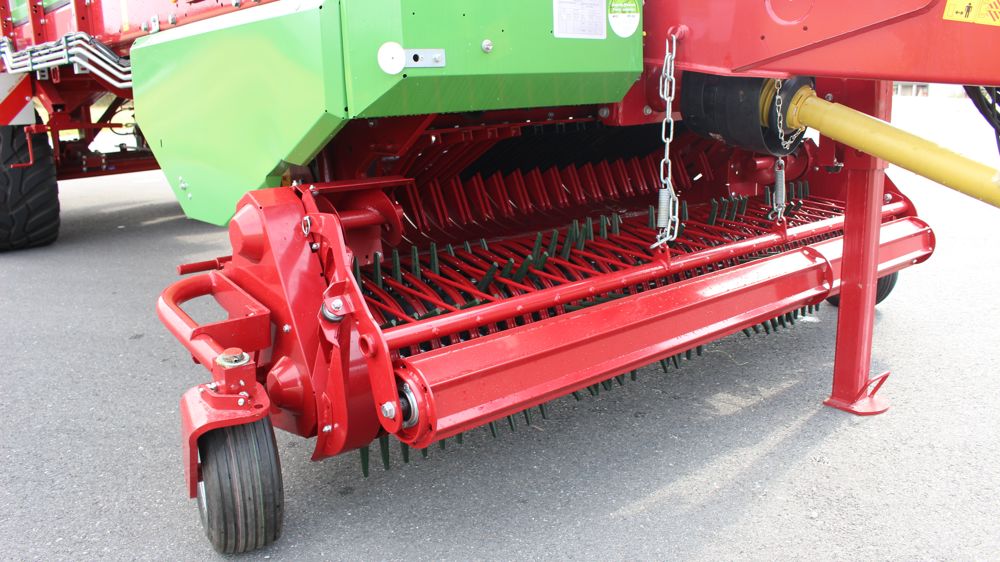 La largeur de travail de 2,25 m est conçue pour les andains volumineux. L’entraînement est hydraulique afin d’adapter rapidement le régime du pick-up aux conditions de récolte. La suspension à parallélogramme offre une importante course pendulaire. Les dents flexibles sont en plastique. Les vis d’alimentation de 300 mm de longueur derrière le pick-up recentrent le fourrage vers le canal d’alimentation de 1,60 m de largeur. La récolte est ensuite acheminée dans la remorque par les ameneurs à peignes.