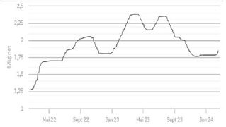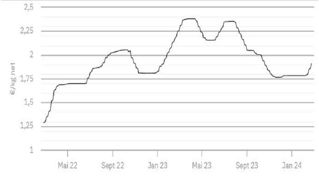 Le prix de base du porc s’est établi à 1,857 €/kg ce lundi 19 février 2024, au Marché du porc breton...