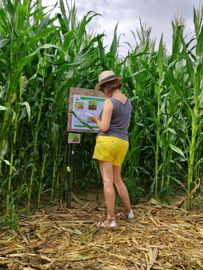 Avant d’accueillir les visiteurs de mi-juillet à mi-septembre, Mathilde sème le maïs grain sur une parcelle d’un hectare, en double rang pour avoir assez d’épaisseur. Lorsqu’il est suffisamment haut, des chemins sont créés à la débroussailleuse. « J’ai un plan défini à l’avance, mais j’adapte en fonction de la pousse du maïs de façon à garder des murs bien hauts, confie l’exploitante. Les chemins varient donc chaque année. Pour être rentable, il faut absolument récolter le maïs. »