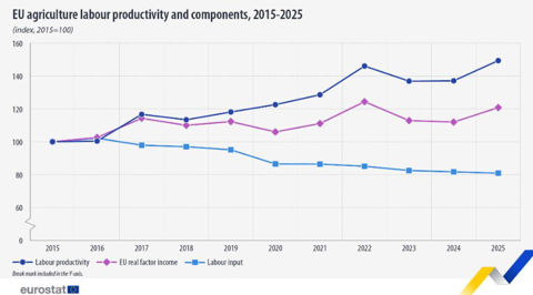 Depuis 2015, la productivité du travail agricole en Europe a progressé de 49,4 % du fait à la fois d’une augmentation du revenu et d’une baisse des coûts de main-d’œuvre. La valeur ajoutée brute de l’industrie agricole de l’Union européenne a augmenté de 10,3 % en 2025 par rapport à l’année précédente.