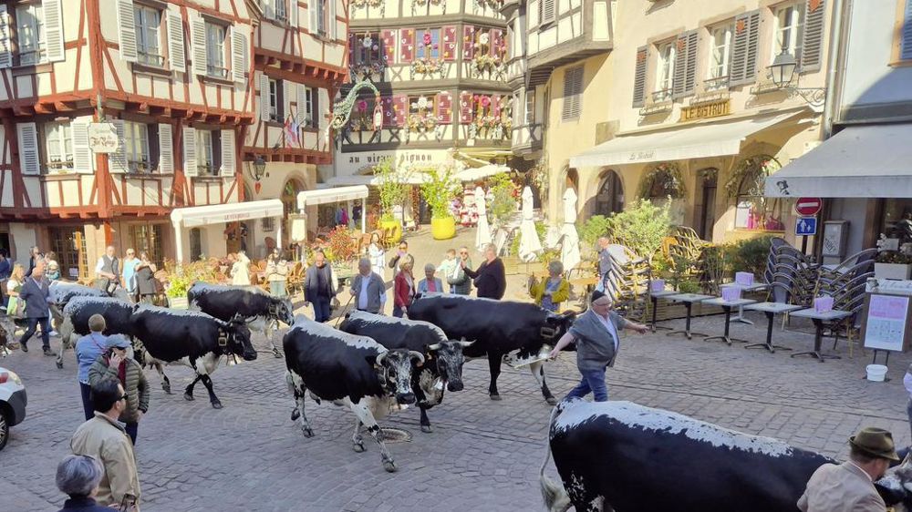 Des vaches en ville ! Mais pas n’importe lesquelles, des vosgiennes ! Samedi 5 avril 2025, quatorze représentantes de la race ont « transhumé » du centre de Colmar jusqu’au parc des expositions de la ville pour signifier aux habitants et 200 spectateurs présents sur la ligne de départ qu’elles avaient maintenant leur festival. Les animaux ont avalé en trente-huit minutes ces 3,5 km au son bruyant de leurs cloches.