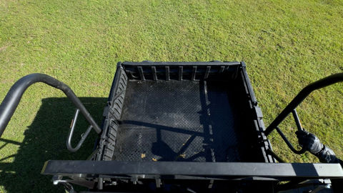 Nous basculons cette benne manuellement, deux vérins à gaz nous assistent dans cette tâche. Néanmoins, nous regrettons d’avoir à basculer la banquette pour lever la benne lorsque la Mule est en configuration quatre places. De plus, l’ouverture du hayon avec deux attaches à bascule, une de chaque côté, n’est pas des plus ergonomiques.