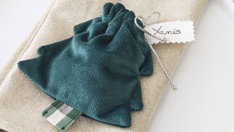 Épinglez le tronc sur l’endroit du sachet le bord ouvert contre le bas du sapin. Épinglez, endroit contre endroit, les pièces principales. Cousez les côtés et bas du pochon. Dégarnissez les angles. Retournez sur l’endroit. À l’aide d’une épingle à nourrice, passez le cordon dans la coulisse. Réalisez des doubles nœuds aux extrémités.