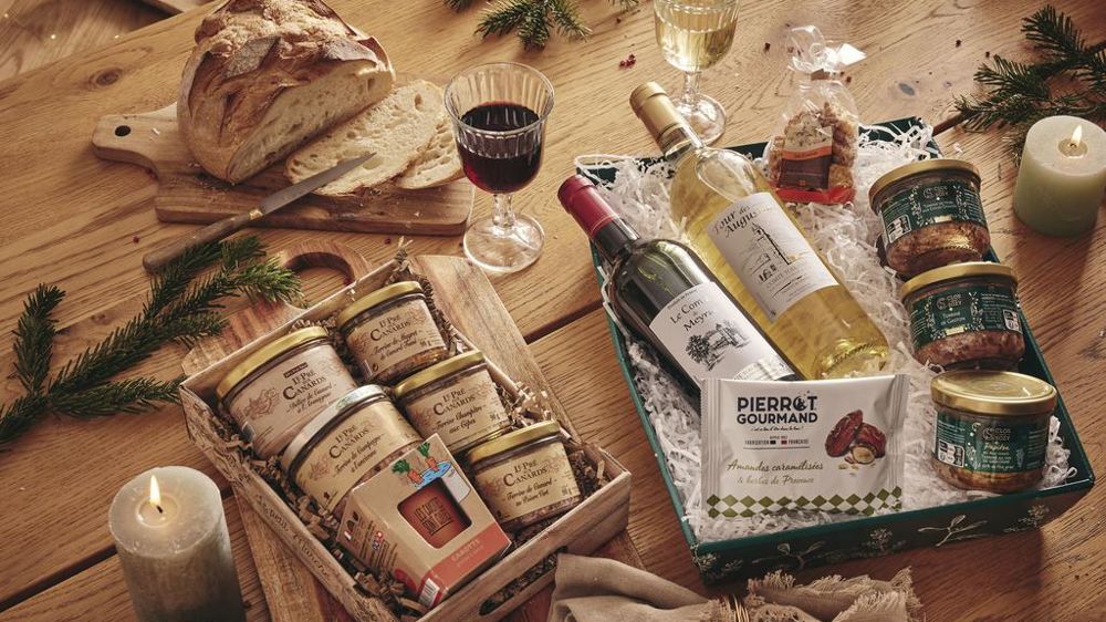 Un large éventail de produits pourra prendre place dans le coffret : foie gras, terrines, fruits secs, infusions, biscuits, confiture, chocolats, miel, vins, spiritueux, etc. Confectionnez vous-même ce panier en vous approvisionnant auprès des agriculteurs de votre secteur ou rendez-vous dans un magasin de producteurs. Les jardineries (Gamm vert, Jardiland, Delbard, etc.) proposent également des corbeilles festives « les sens du terroir » (en photo).