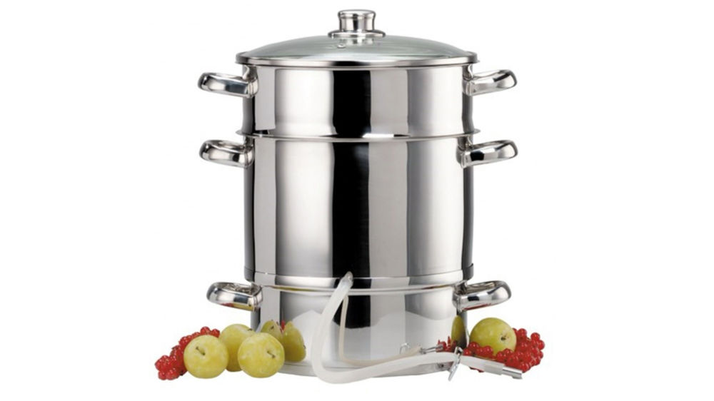 Le principe est simple : l’eau chauffe dans le récipient inférieur, les fruits sont placés dans le panier supérieur (environ 2,5 kg) et le jus s’écoule dans le compartiment intermédiaire. Le jus recueilli peut être consommé tel quel ou transformé en sirop ou en gelée. Nous avons testé avec succès le modèle de la marque Baumalu (diamètre de 26 cm) pour réaliser du jus de cerises, ensuite transformé en gelée.
